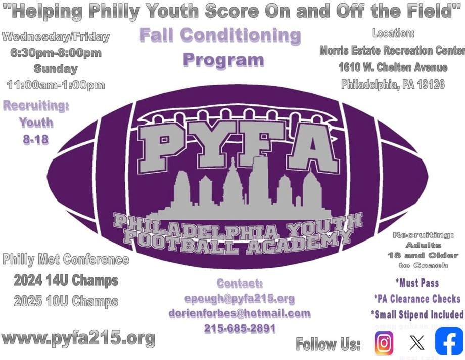 The Philadelphia Youth Football Academy is a sports based youth development initiative designed to mentor Philadelphia youth. PYFA assist youth from low-income families in Philadelphia with strengthening their chances to live healthy lifestyles, graduate and obtain full-time employment, become entrepreneurs or gain admission to post-secondary institutions.
